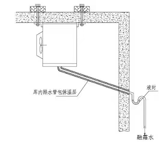 2、冷風(fēng)機(jī)的排水管道通往冷庫外應(yīng)有一定的坡度,使融霜水順利地排出庫外;